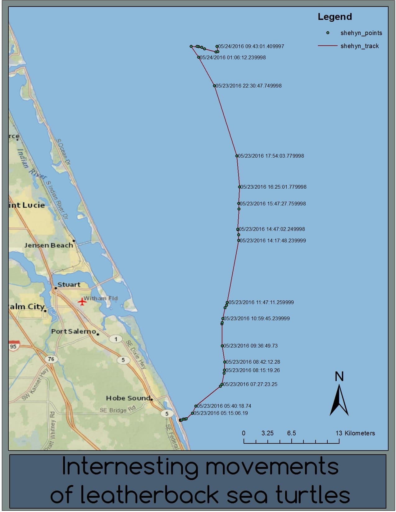 Over the years, we've learned that after nesting, leatherbacks head straight to the Florida Current and head north. They take 2-3 days to swim north and eventually reach the Cape Canaveral area. There they do something very important that we call "The Turn." If leatherbacks don't turn there, it could mean that they're done for the season and they'll keep heading north. But if they make "the turn," then we know they're heading back this way for at least one more nest. So keep your eyes peeled on our WEBSITE and keep your fingers crossed that Shehyn makes "the turn!" If not, in about 25 days, her transmitter will fall to the bottom of the Ocean (as a safety measure) with all of its valuable data with it.